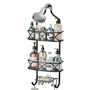 Show more This innovative 3-tier hanging shower caddy over the shower head is the ultimate solution for keeping your bath essentials organized. Made from premium iron with a sleek black finish, this storage unit easily accommodates bottles of various shapes and sizes, ensuring that everything from shampoos to conditioners is within reach. The thoughtful design minimizes spills; the deep baskets hold your items securely, preventing any slip-offs that could leave a mess on your shower floor.