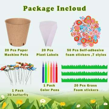 Garden Paper Pot Craft Kit 20 Pack Flower Plant Spring Craft with 50pcs Adhesive Foam Stickers 20pcs Paper Mache Pots Label Pen Flower Planting Growing Kit Science for Kids Mother Day