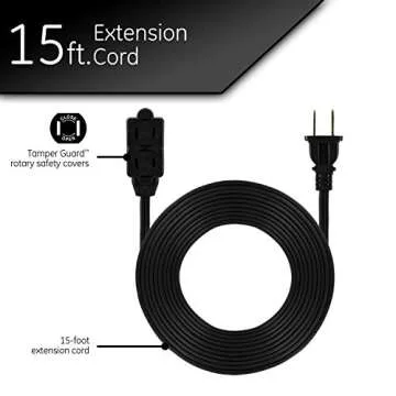The extended 15-ft power cord is crafted to be robust, ensuring it lasts a lifetime while being flexible enough for easy use wherever you need it. With a patented Tamper Guard rotary safety cover, this extension cord prioritizes you and your loved ones' safety, guarding against accidental shocks that could disrupt your day.