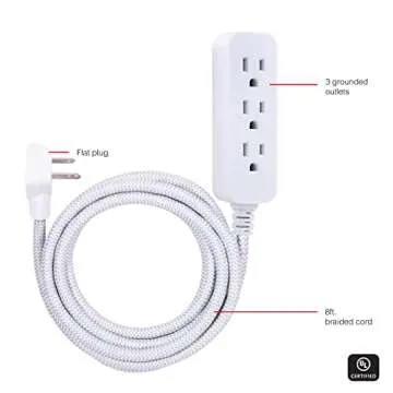 Show moreIntroducing the ultimate solution for powering your devices while adding a touch of style to your space—the elegant Power Strip Surge Protector. Designed by GE, this eight-foot extension cord features a three-outlet surge protector, making it the ideal companion for your laptop, desktop computer, gaming console, TV, and more. With its stunning gray and white chevron patterned braided fabric cord, this power strip doesn't just function well; it elevates the aesthetics of any room in your home or office.