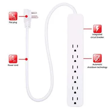 Show more Introducing the ultimate solution for your power needs, the Expanded Power Extension Cord! Each extension cord comes clad in a sleek white finish and boasts 6 grounded AC outlets, ideal for transforming any space into an organized and effective electronic hub. Whether you're in a home office, workshop, or garage, this extension cord ensures that all your devices are powered up and ready to go. Designed for versatility, the 2ft power cord features robust heavy-duty cable encased in resilient PVC insulation, guaranteeing durability that lasts a lifetime. Its flexible nature makes it easy to maneuver into place while the space-saving flat plug design allows it to fit snugly against the wall, eliminating unsightly bulges behind furniture.