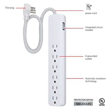 GE UltraPro 6-Outlet Surge Protector, 2 Ft Designer Braided Extension Cord, 560 Joules, Flat Plug, Wall Mount, UL Listed, White, 45264