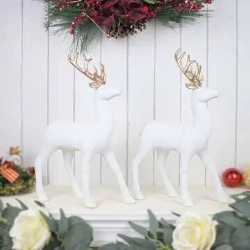Show moreElevate your winter decor with the GEDLIRE Christmas Reindeer Figurine Decoration set! This enchanting collection features two beautifully crafted reindeer statues that embody elegance and charm. Standing at 9 inches long and 12.6 inches high, these white resin deer statues are perfectly sized to enhance any festive display, whether on your dining table, under your Christmas tree, or atop decorative shelves. Their exquisite finish—including a sleek surface polishing process—adds a touch of sophistication, making them a delightful addition to your seasonal decoration.