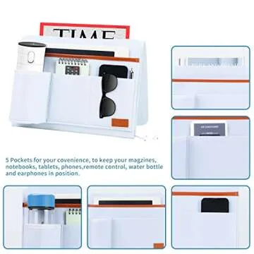 Geeice Bedside Caddy, 5 Pockets Remote Control Holder Bed Sofa storage, Tablet Phone Magazine organizer Side Pocket for Home Dorm Desk, White