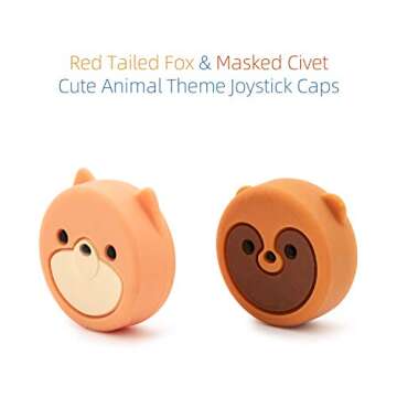 Show more Introducing the GeekShare 4PCS Cute Animal Theme Thumb Grip Caps, designed specifically for your Nintendo Switch, Switch Lite, and OLED! These charming joystick covers feature delightful designs of adorable fox and civet characters, bringing a fun and vibrant touch to your gaming experience. Made from high-quality, odorless silicone material, these thumb grips not only enhance your controller's aesthetic but also provide an extra layer of protection against scratches and dirt. The soft and comfortable touch ensures that your fingers can glide smoothly over the analog sticks, allowing for better control and precision during gameplay.