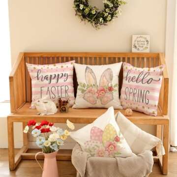 GEEORY Happy Easter Pillow Covers 18x18 Inch Set of 4, Striped Hello Spring Floral Bunny Rabbit Eggs Decorative Farmhouse Throw Pillowcases for Home Sofa Couch Decoration (Pink) G451-18