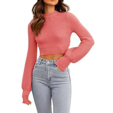 GeGekoko Womens Mock Neck Knit Cropped Sweaters Puff Sleeve Trendy Fall Ribbed Pullover Pink