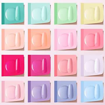 Show more The Rainbow 16 Colors Gel Nail Polish set transports you to a vibrant world of color, offering an exquisite selection of shades designed to ignite creativity and happiness. With a classic rainbow palette, each polish captures the essence of fresh spring days and sunny summer vibes. The stunning variety of hues encompasses every imaginable color, ensuring your nail art is always on-trend and unique. The invigorating colors are highly pigmented, providing you with brilliant and vivid finishes suitable for any occasion—from daily wear and beach outings to cozy dates and everything in between.