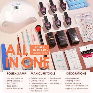 Show more Introducing the Gellen All-in-one Gel Nail Polish Starter Kit, the ultimate solution for achieving salon-quality nails right from the comfort of your home. With this comprehensive kit, you will receive a 54W powerful nail lamp, six exquisite shades of gel nail polish in elegant nude, gray, and brown tones, a glossy/base top coat, and an array of nail art rhinestones. Everything is thoughtfully packed in a delicate gift box, making it a perfect present for yourself or anyone who loves self-care rituals.