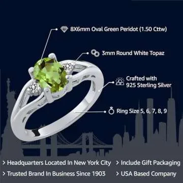 Gem Stone King 925 Sterling Silver Green Peridot and White Topaz 3 Stone Ring For Women | 1.50 Cttw | Gemstone Birthstone | Oval 8X6MM | Available In Size 5,6,7,8,9