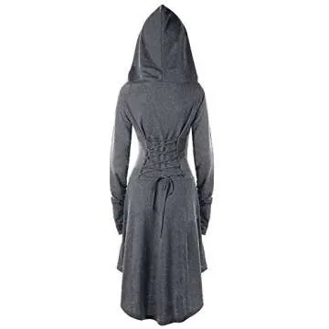 Gemijack Womens Renaissance Costumes Hooded Robe Lace Up Vintage Pullover High Low Long Hoodie Dress Cloak