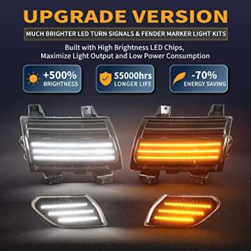 Show moreIlluminate your driving experience with the Gempro LED Fender Side Marker Turn Signal Lights Kits, specially designed for the iconic J'eep Wrangler JL (2018-2020) and Gladiator JT models (2020-2022). Featuring advanced sequential amber turn signals combined with a sleek white daytime running light (DRL), these marker lights not only enhance visibility but also elevate the aesthetics of your vehicle. With a low power consumption and high efficiency, they merge modern technology with energy-saving benefits, ensuring you can enjoy stunning lights without compromise.