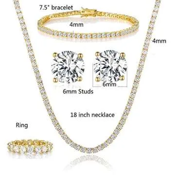 Gemsme 18K Yellow Gold Plated Tennis Necklace/Bracelet/Earrings/Band Ring Sets Pack of 4