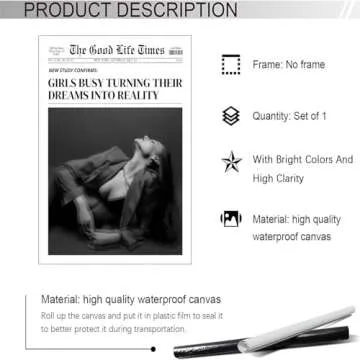 Show more This stunning canvas wall art captures the essence of timeless elegance with its Retro Chic Design. Inspired by the vintage black and white newspaper aesthetic, it effortlessly blends nostalgia with modern sophistication to bring a unique charm to any space. The wall art showcases a Girl Power Theme, featuring illustrations of determined young women transforming their dreams into vibrant realities. This empowering artwork not only beautifies your surroundings but also serves as a daily reminder of female strength and ambition.