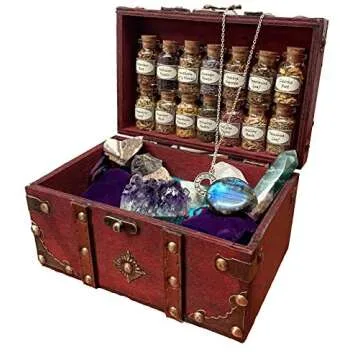 The kit includes a variety of crystals, 14 unique herbs in glass vials, a mini brass bell, a necklace representing the phases of the moon, and a keepsake wooden box.