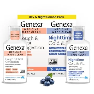 Show moreIntroducing the Genexa Daytime Cough & Congestion + Nighttime Severe Cold & Flu Combo Pack, your ultimate ally in battle against those pesky cold symptoms! This thoughtfully curated two-pack features a **Daytime Cough & Chest Support** formula that effectively addresses occasional cough and chest congestion caused by minor throat and bronchial irritation, as well as a **Nighttime Cold & Flu Support** to ensure a restful sleep while easing discomfort, sneezing, runny nose, and more. Carefully crafted with your wellness in mind, this remedy incorporates vital ingredients like acetaminophen, dextromethorphan HBr, and doxylamine succinate without any unnecessary additives. Plus, it's infused with a delightful **organic blueberry flavor**, turning medicine time into a flavorful experience—free from artificial sweeteners, preservatives, and dyes.
