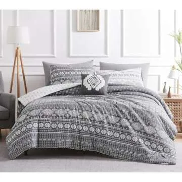Geniospin Queen Comforter Set, Boho Bed in a Bag 7PCS, Grey Reversible Aztec Pattern, Soft Microfiber Fill Bedding, All Season Comfortable with Comforter, Sheets, Pillowcases & Shams (Grey, 90''x90'')
