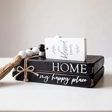 Show more Transform your living environment into a serene retreat with the GENMOUS Black Decorative Books Set. This enchanting decorative book ensemble beautifully marries rustic charm with modern elegance, providing not just decor, but a sense of warmth to any space. Crafted with a unique bevelled edge and a rustic finish, these faux wood books exude sophistication. The delightful twine accents seamlessly enhance their farmhouse aesthetic, making them suitable for all types of decor, from contemporary chic to vintage classics. These stylish stackable books are not only an eye-catching centerpiece but also add a touch of personality to your home.