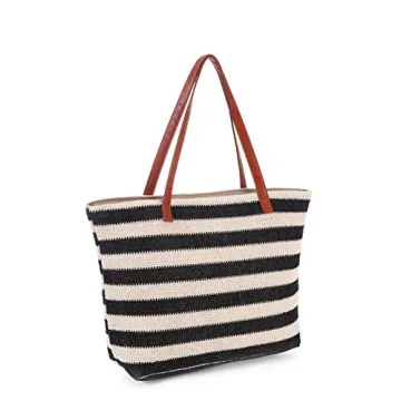 Genovega Women Beach Tote Utility Bag with Zipper, Stripe Black Cute Xl Large Woven Straw Purse Summer Handbag for Travel, Mom Female Sister Wife Girlfriend