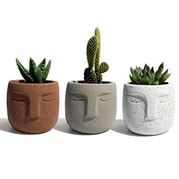 Show more Elevate your indoor greenery with the whimsical Gepege Succulent Plants Pot Set. These charming concrete face planters are designed not just to house your plants but to create an unforgettable focal point in any room. Measuring at 3.15 inches wide and 2.95 inches tall, each pot is perfectly sized for small succulents, tiny ferns, and colorful cacti, allowing you to express your creativity while showcasing nature’s beauty. Made from durable cement, these planters merge durability with delightful aesthetics, ensuring they serve as both a functional accessory and a piece of modern art that livens up your home or office space.
