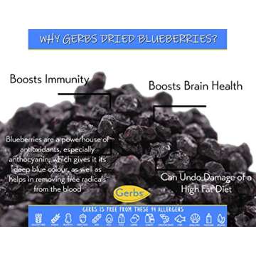 Show moreDiscover the unparalleled taste and health benefits of GERBS Dried Blueberries, carefully packaged in a 14 oz. re-closeable bag, perfect for maintaining their freshness and flavor. Sourced from the lush landscapes of Cape Cod, these blueberries are freshly harvested and dehydrated to preserve their natural sweetness, allowing you to enjoy nature’s candy whenever you crave it. Packaged in Rhode Island on dedicated allergen-free equipment by our specially trained staff, each handful guarantees quality and safety for you and your family.