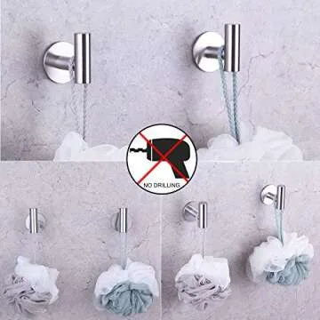 Show moreIntroducing the GERZWY Adhesive Hooks – the perfect blend of utility and aesthetic appeal for your living spaces. Crafted from 100% premium SUS 304 stainless steel, these hooks offer unparalleled resistance to rust and corrosion, making them ideal for moist environments like bathrooms or kitchens. Thanks to their premier finishing process, these hooks not only maintain their sleek brushed steel finish but also provide long-lasting durability, ensuring they stay looking sharp and functional over time. Installation is a breeze with the innovative self-adhesive backing; simply peel, stick, and press for a hassle-free setup without any drilling! What’s more, they are versatile enough to be used for a wide range of applications – from hanging jackets and towels to kitchen utensils and bags.