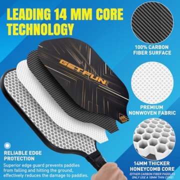 Show more If you're on the lookout for the perfect gift for pickleball enthusiasts, look no further than the GETFUN GF-01 pickleball paddle set. This exceptional set features a premium carbon surface combined with a 14mm thicker polypropylene core, ensuring unrivaled control and performance during every game. Unlike other paddles that settle for a thin 10mm core, this paddle delivers superior shock absorbability and reduces vibrations, making it perfect for long hours of play. Experience the exhilaration as you hit with precision and control, thanks to the high-quality carbon fiber that perfectly balances power, control, and spin.