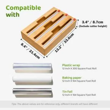 Show moreIntroducing the GEVLOX Bamboo Foil and Plastic Wrap Organizer, a multifunctional kitchen essential designed to streamline your meal prep and keep your kitchen organized. With its innovative 3-in-1 design, this versatile dispenser offers a dedicated space for plastic wrap, aluminum foil, and parchment paper, making it easier than ever to access and cut your wraps with precision. Crafted from premium 100% bamboo, not only does this organizer boast durability, but it also adds a touch of elegance to your kitchen decor.