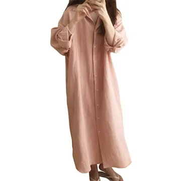 GGUHHU Womens Chic Button Down Rolled-Up Sleeve Long Cotton Blouse Maxi Dress (Small, Light Pink)