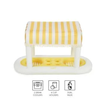 Transform your summer gatherings with the incredible FUNBOY Giant Floating Yellow Cabana Stripe Drink Station! This beast of a drink station spans nearly 6 feet long and rises over 3 feet high, becoming the centerpiece of every pool party. With its vibrant lemonade yellow and cream color scheme combined with playful cabana stripes and cotton fringe, it doesn't just serve drinks; it adds a splash of summer magic to your outdoor festivities. Picture it standing...