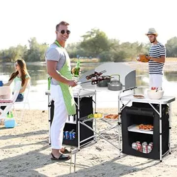 Giantex Camping Kitchen Station, Folding Grill Table with 26'' Tabletop, 2 Side Tables, Storage Organizer, Detachable Windscreen, Portable Camp Cook Outdoor Prep Station Backyard BBQ Picnic (Black)