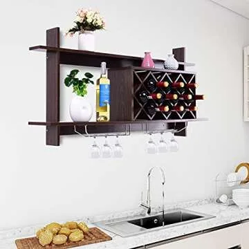 Giantex Wine Rack Wall Mounted, 6-Bottle Wood Hanging Wall Wine Rack Shelf w/Glass Holder, Modern Diamond-Shaped Wine Glass Rack, Floating Wine Shelves for Home Bar, Kitchen, Dining Room, Black
