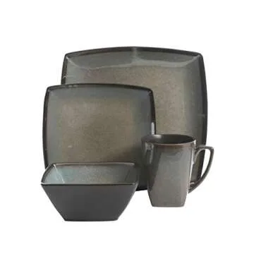 Gibson Elite Tequesta Square Reactive Glaze Stoneware Plates and Bowls Dishes Dinnerware Set, Service for 4 (16pcs), Taupe