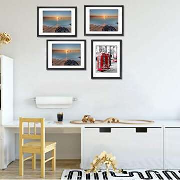 This versatile set includes four frames, each expertly matted to display 11x17 pictures. The included mat not only adds a touch of refinement but also creates a layered effect that enhances visual appeal. Whether you choose to hang them vertically or horizontally, the frames will complement your art style without overshadowing it. The sleek design, including the light wood grain finish, adds an inviting touch to your gallery wall, living room, office, or bedroom.