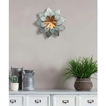 Introducing the stunning Lightweight Rustic Galvanized Metal Flower Wall Décor. Crafted with an eye-catching daisy design, this charming wall art piece is perfect for adding a touch of rustic elegance to any indoor or outdoor setting. Its gold center accent contrasts beautifully with the galvanized metal, creating a visual appeal that will draw attention in any room or garden. Measuring at 11.5x1.5 inches, it is an ideal size to complement your kitchen,...