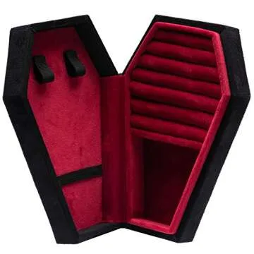 Unlike typical jewelry organizers, our coffin-shaped case stands out with its gothic allure, making it perfect for individuals with a unique taste in decor. Other common jewelry boxes lack the distinctive design that not only stores items but also enhances your home aesthetic. While many organizers can hold jewelry, few provide the thematic charm that sets our Velvet Coffin Jewelry Case apart.