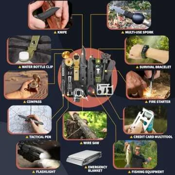 The survival kit includes a survival knife, fire starter, tactical pen, flashlight, wire saw, emergency blanket, credit card tool, multi-use spoon and fork, and a waterproof box.