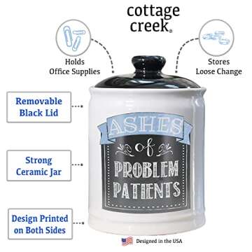 Introducing our unique and hilarious ceramic jar designed to add a touch of humor and functionality to your space! This one-of-a-kind jar, whimsically labeled as the "Ashes of Problem Patients," is perfect for anyone in the medical profession or those who just need a good laugh. Crafted from high-quality stoneware, it not only serves as a great conversation starter but also functions as a chic candy jar or coin bank, fitting seamlessly into your kitchen or office decor.
