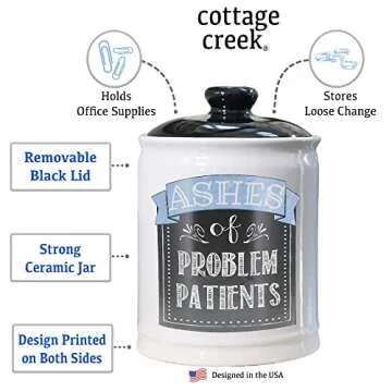 Show moreIntroducing our unique and hilarious ceramic jar designed to add a touch of humor and functionality to your space! This one-of-a-kind jar, whimsically labeled as the "Ashes of Problem Patients," is perfect for anyone in the medical profession or those who just need a good laugh. Crafted from high-quality stoneware, it not only serves as a great conversation starter but also functions as a chic candy jar or coin bank, fitting seamlessly into your kitchen or office decor.