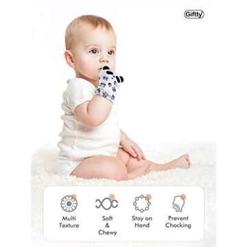 Show more Introducing the Giftty Baby Teething Mitten Panda Teether Mitt—the perfect multi-functional toy designed specifically for infants. Gone are the days of worrying about teething troubles; this innovative mitten not only provides the necessary relief from teething discomfort but also engages your baby's senses in an enriching manner. Crafted with soft, food-grade silicone and adorned with an adorable panda design, this teething mitten captivates babies with its high-contrast black and white colors and crinkling noise that mimics candy unwrapping. Not only will babies love to chew on it, but they will also be enthralled during playtime, aiding in their early sensory development.