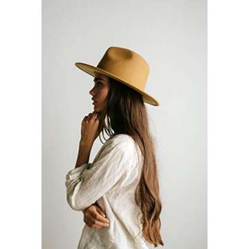 Show moreStep up your fashion game with the Gigi Pip Wes Wide Brim Felt Fedora Hat for Women, meticulously crafted from 100% Australian wool. This chic and sophisticated fedora is not just a hat; it’s a versatile accessory that enhances any outfit, making it a perfect choice for all seasons. The classic design features a structured top with a generous 3-inch brim, providing elegance and style whether you're strolling through a sunlit park in spring or layering up in the winter chill. Its modern mustard hue adds a pop of color to your wardrobe, making a bold statement that’s sure to turn heads.