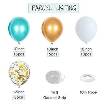The GIHOO balloon kit includes a stylish combination of green and gold chrome balloons, along with gold confetti and white balloons, ensuring a vibrant mix for your event.