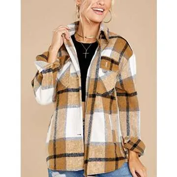 Show moreThe Gihuo Women's Plaid Flannel Shacket is a stylishly versatile addition to your fall and winter wardrobe. This khaki plaid button-down jacket is designed for comfort without sacrificing aesthetics. Made with a soft flannel fabric, it offers warmth and style, making it perfect for layering during those chilly months. With its loose fit, this casual shacket effortlessly bridges the gap between a shirt and a jacket, providing an ideal option for those who want to stay cozy while looking chic.