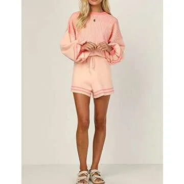 Gihuo Women' s Striped 2 Piece Outfits Crewneck Knit Pullover Sweater Shorts Set Wide Leg Matching Set Loungewear(Pink-XS)