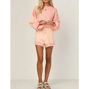 Gihuo Women' s Striped 2 Piece Outfits Crewneck Knit Pullover Sweater Shorts Set Wide Leg Matching Set Loungewear(Pink-S)