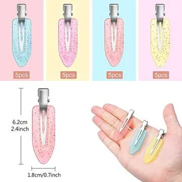 Show moreDiscover the ultimate hair styling solution with the Gingbiss 20 Pcs No Bend Hair Clips. These innovative curl pin clips feature a unique no crease design, ensuring that your hair remains smooth and free of creases, even after long hours of wear. Crafted with both style and functionality in mind, these clips come in a delightful array of 4 translucent glitter colors: blue, pink, purple, and yellow. Housed in a chic storage box measuring 12.5×8.5×1.8cm, these lightweight clips (only 2.7g each and 6cm long) are easy to carry and perfect for on-the-go styling.