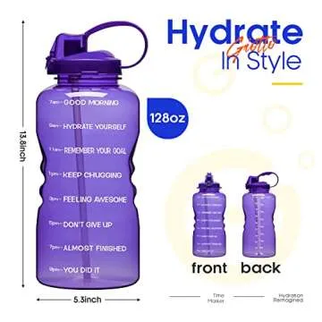 Show more Stay hydrated and motivated with the Giotto Large 1 Gallon/128oz Motivational Water Bottle. This innovative water jug features a creative design that includes inspiring quotes alongside clear time markers, helping you to effortlessly track your daily water intake. Made from top-quality, food-grade Tritan co-polyester, this bottle is not only durable but also 100% BPA and toxin-free, ensuring that every sip you take is safe and refreshing. Whether you're striving for fitness goals, weight loss, or simply looking to maintain good health, this bottle is your perfect companion.