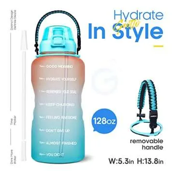 Show more Introducing the Giotto Large 1 Gallon Motivational Water Bottle — your ultimate hydration partner that combines functionality with style! Crafted from high-quality, eco-friendly Tritan plastic, this impressive 128 oz water jug is designed to inspire and motivate. With motivational quotes and time markers prominently displayed, it guides you to meet your daily hydration goals, making it a must-have for fitness enthusiasts, athletes, and anyone aiming to enhance their health journey.
