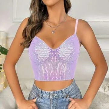 Giovacker Women's Sexy V-Neck Spaghetti Strap Sparkle Sequined Crop Tops Tube Top Bustier Vest Tank Rave Clubwear Camis Tee, Purple/L