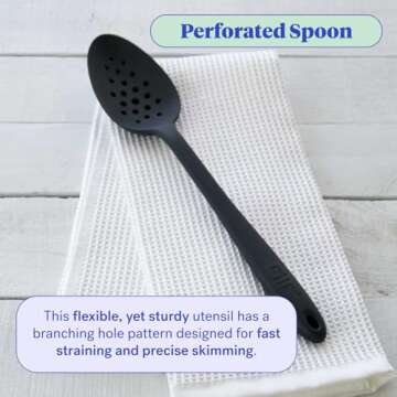 Show moreIntroducing the GIR: Get It Right - 13.5" Slotted Spoon, the ultimate kitchen utensil designed to elevate your culinary experience. Crafted from premium platinum-grade silicone, this multi-purpose spoon is engineered to withstand high temperatures of up to 425°F, ensuring it never gets too hot to handle. Its unique branching hole pattern allows for efficient straining and precise skimming, making it a fantastic tool for both home cooks and professional chefs alike. The generous depth of the bowl ensures effortless stirring and serving, while the gently flexible edges make it easy to scrape every bit from your cooking pots. With its sleek black finish, this spoon not only performs beautifully but also adds a touch of sophistication to your kitchen utensils.